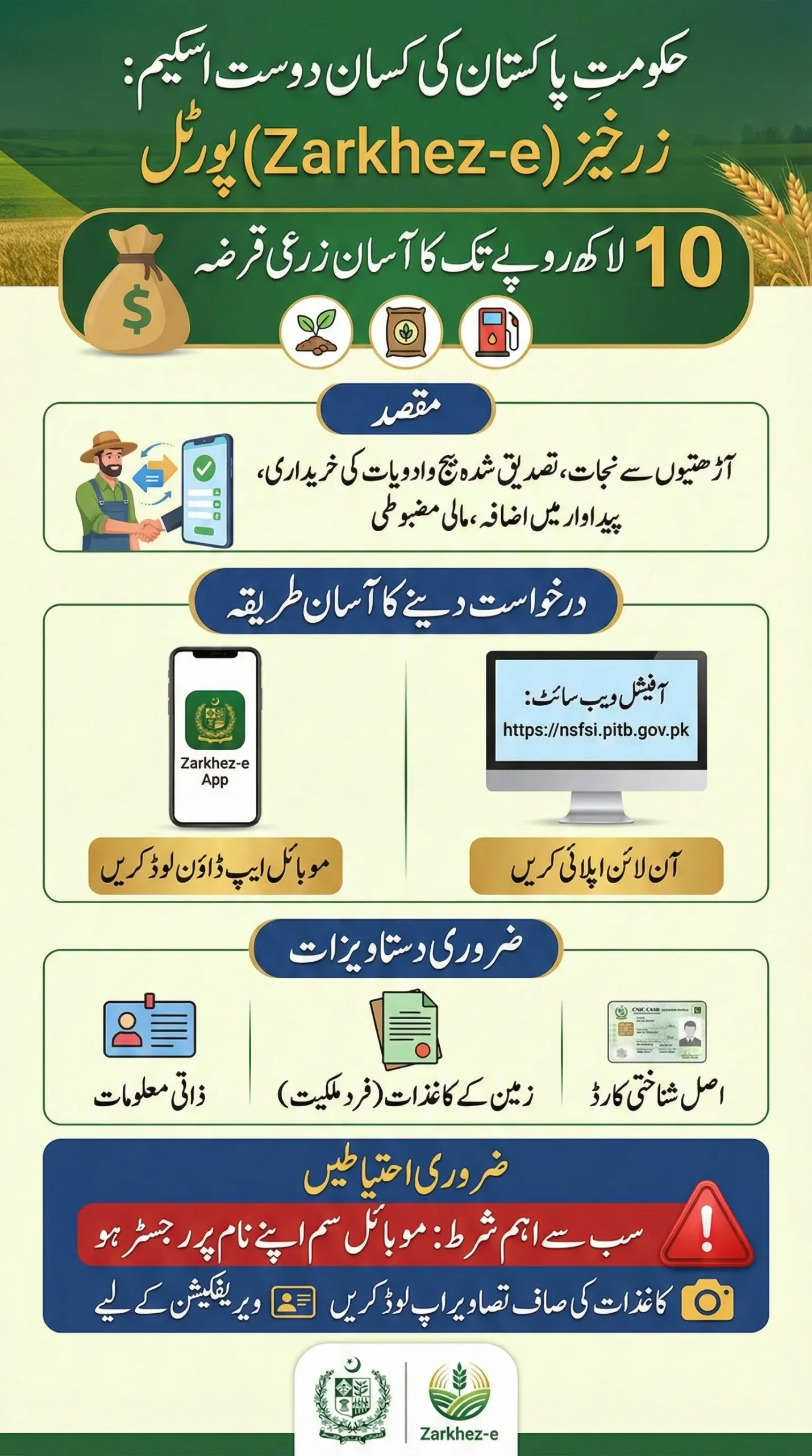 Farmers can apply from home using the Zarkhez-e mobile app or the official online portal by submitting CNIC, land, and farm details. The program supports timely farming operations, improves productivity, and reduces financial stress. Accurate information and CNIC-registered SIM are mandatory, while final loan approval depends on bank verification and eligibility review.
