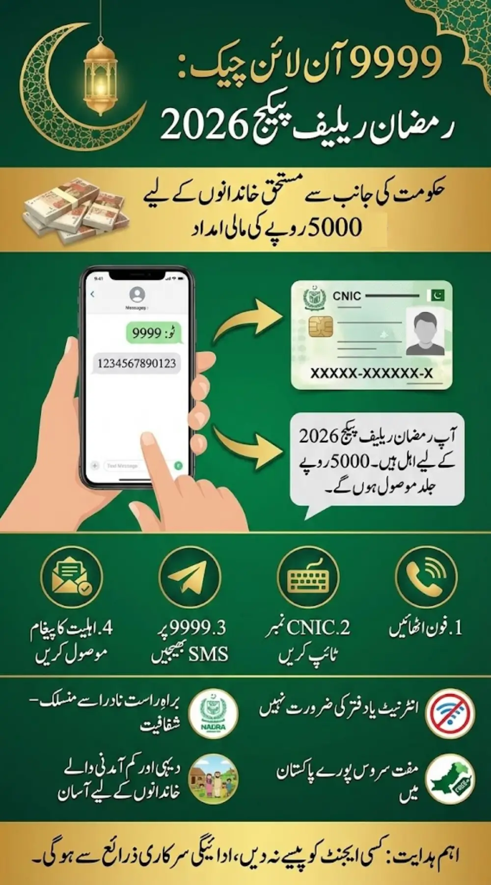 It is a government SMS service that checks eligibility for Rs. 5,000 under the Ramzan Relief Package 2026.