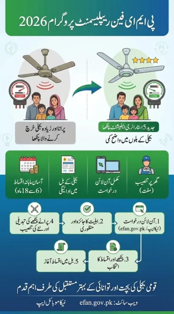 PM E Fan Replacement Program 2026 offers practical relief to households struggling with high electricity bills by allowing them to replace old ceiling fans with 5-star energy-efficient fans through online registration at efan.gov.pk. The program removes upfront costs and spreads payments over easy monthly installments added to electricity bills.