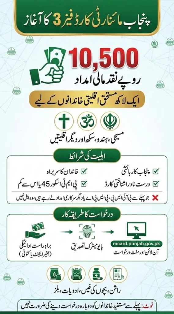 Eligible Christian, Hindu, Sikh, and other minority households with a PMT score of 45 or below can apply online at mcard.punjab.gov.pk. Previous beneficiaries do not need to reapply. With biometric verification, no agents, and zero deductions, this program provides dignity, relief, and real support for groceries, education, healthcare, and basic household needs during tough economic times.